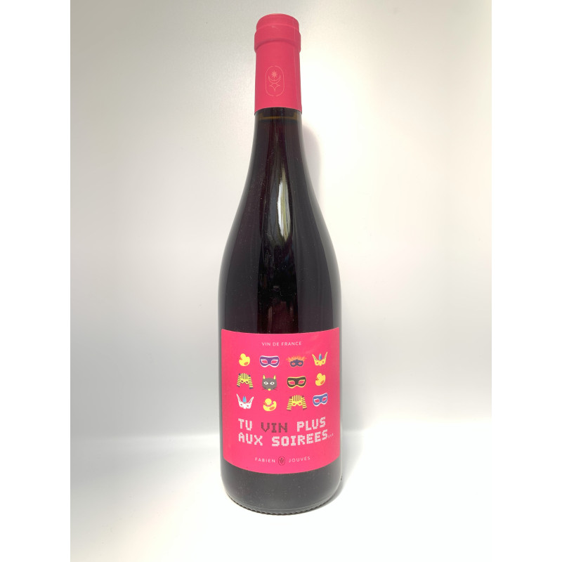 Tu vin plus aux soirées est issu de plusieurs parcelles de jeunes vignes conduites en bio. La fermentation naturelle se fait en grappes entières, dans des cuves béton et barriques pendant 7 jours. Élevage en cuves béton et barriques durant 6 mois. Léger sulfitage